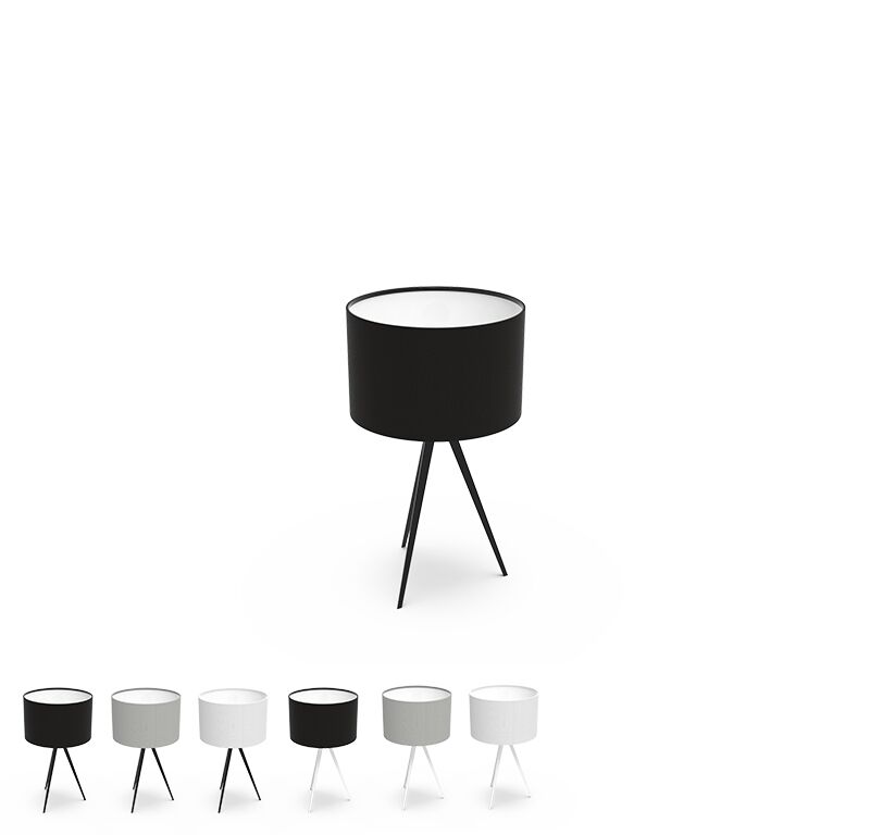 Lampenschirm in blickdichtem Stoff schwarz, grau oder weiss, 3-Bein Standfuss aus Aluminium in schwarz oder weiss, Netzbetrieb (auf Wunsch mit Akku-Pack 7.2AH 12V, Brenndauer mind. 20h), inkl. Leuchtmittel