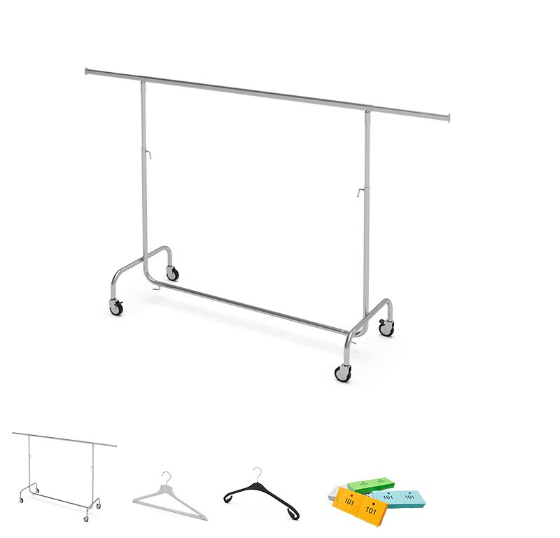 Garderobenständer mieten – Der Garderobenständer zum mieten eignet sich durch seine Mobilität & stabile Bauweise ausgezeichnet für den professionellen Eventeinsatz. Dank den seitlich in das Hauptrohr eingelassenen & ausziehbaren Erweiterungsstangen kann der rollbare Kleiderständer auf bis zu 220cm Länge ausgefahren werden. Damit bietet er Platz für ca. 30 Winter- & 50 Sommergarderoben. Garderobennummern Blöcke in 100er Serien sowie Kleiderbügel sind separat erhältlich. Jetzt unsere mobile Kleiderständer mieten.