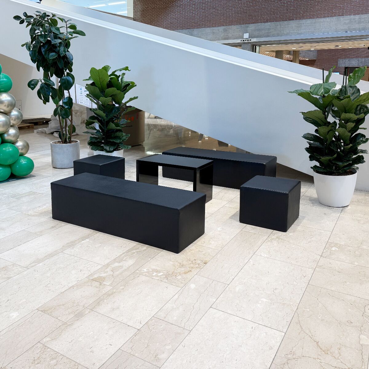 Lounge Möbel mieten statt kaufen – Die Mini Lounge Garnitur eigenet sich speziell für den mobilen Messe & Event Einsatz bei geringen Platzverhältnissen. Für einen langanhaltenden Sitzkomfort sorgt dabei die Qualitätspolsterung der Sitzelemente. Der glanzlackierte Beistelltisch im kubischen Design unterstreicht das professionelle Erscheinungsbild und lässt sich, dank einheitlicher Oberfläche, mit vielen weiteren Mietmöbel wie Apéro Stehtischen oder Theken erweitern. Jetzt Loungemöbel mieten mit Sitzbank & Lounge Würfel.