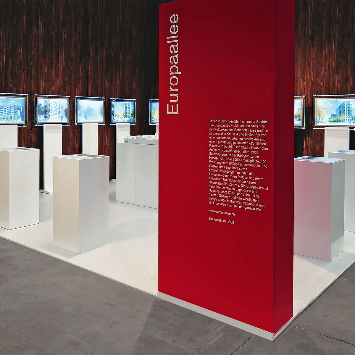 • weisse messe theken auf einem messestand mit kunstpflanze sowie werbewand und holzboden