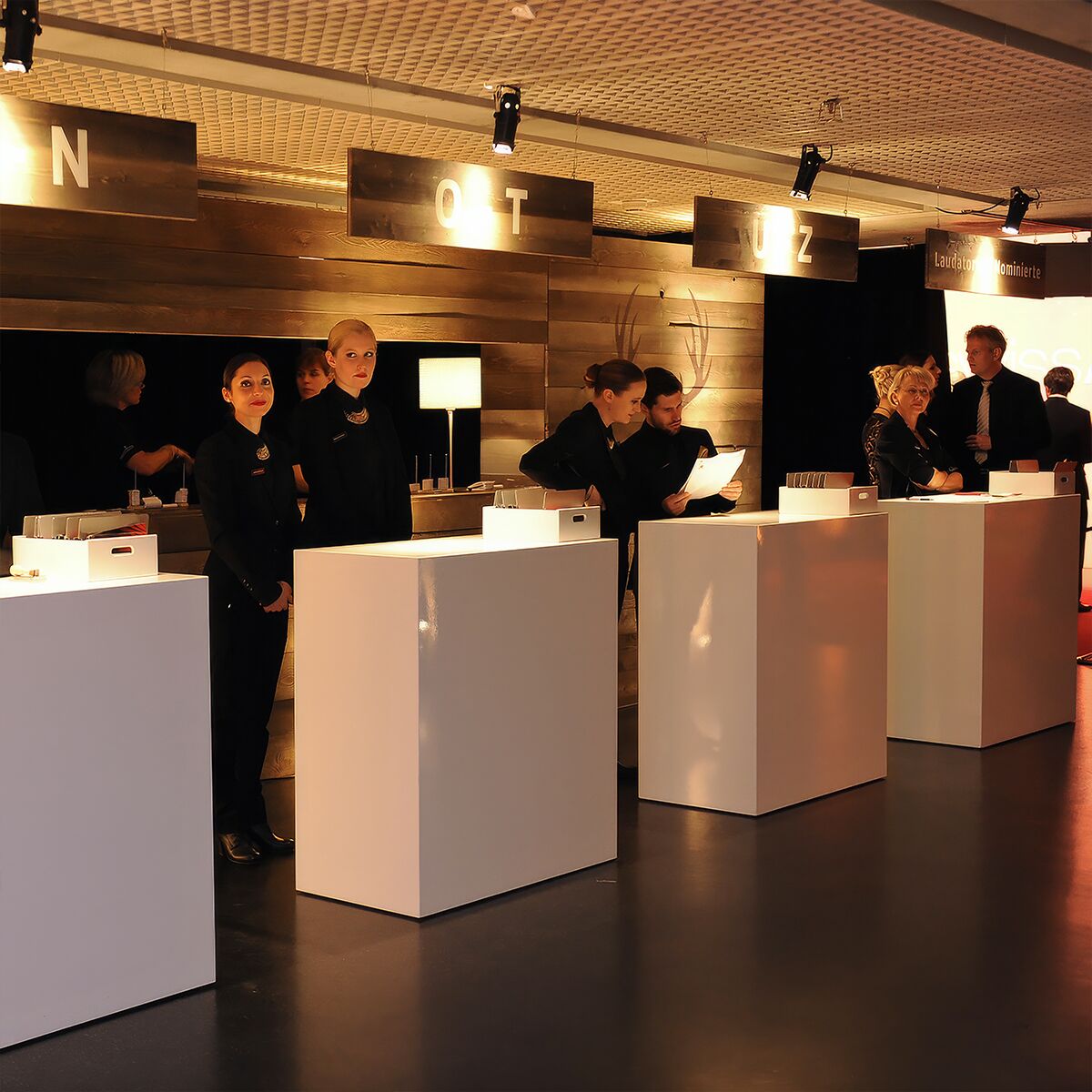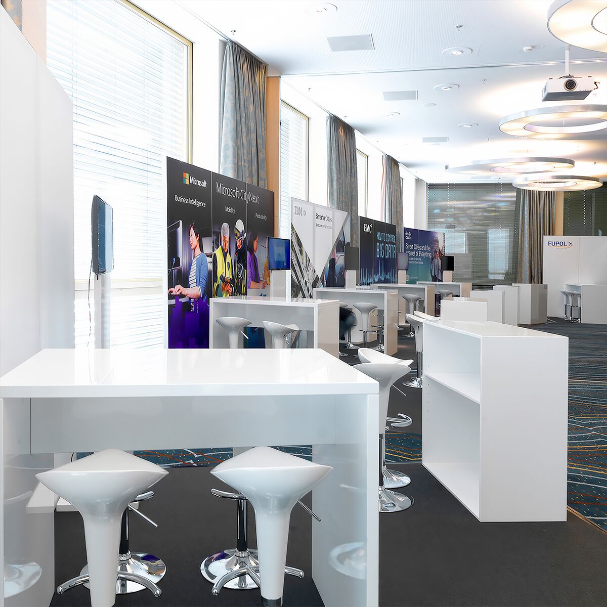 - Besprechungstheke oder Event-Desk: Maßgeschneidert als Ort für Gespräche, Anmeldung oder Prospektverteilung – dank modularer Gestaltungsmöglichkeiten.