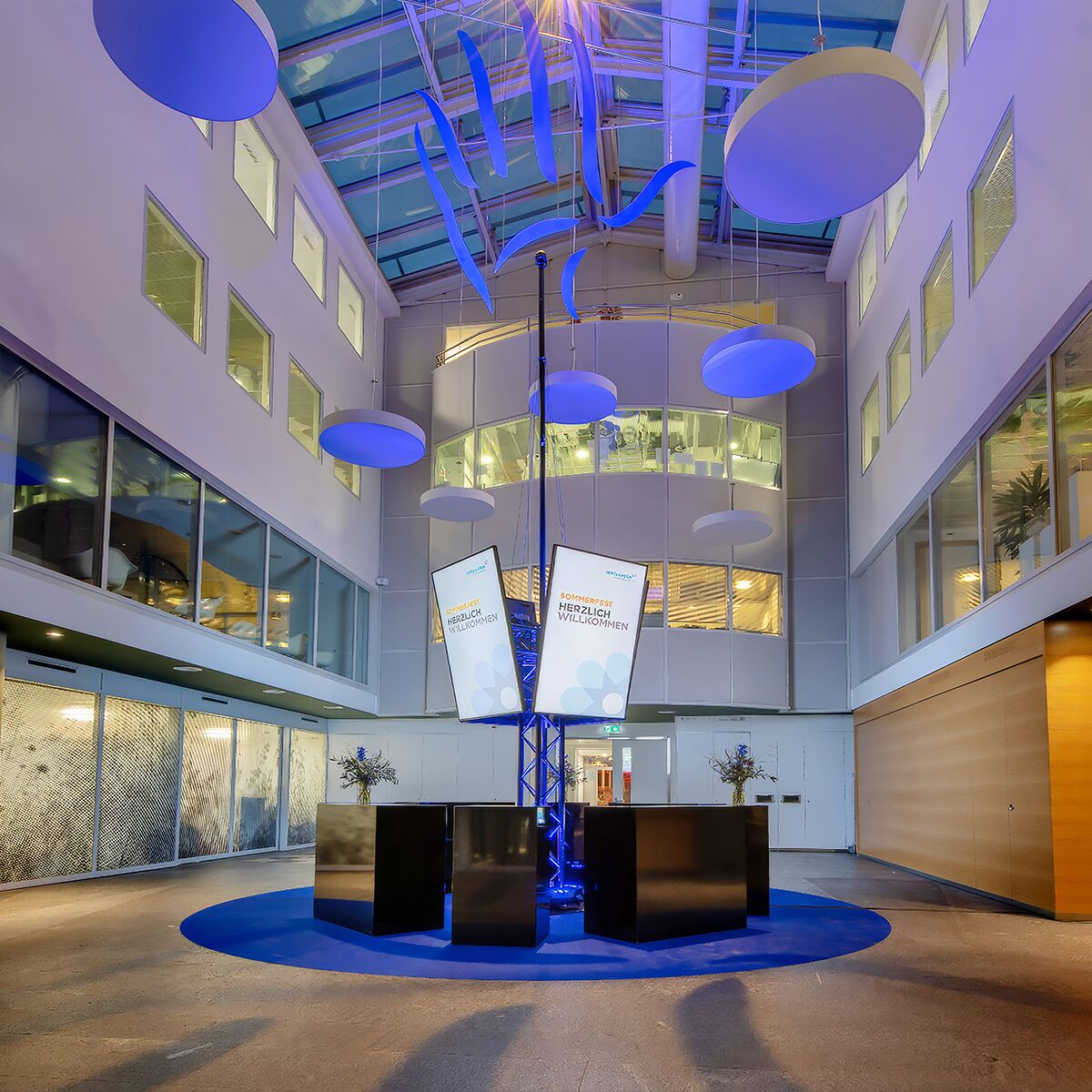 - Empfangsbereich / Lobby: Der Welcome Desk gibt Gästen Orientierung und dient als stilvolles Begrüßungsmodul – inklusive Branding auf der Front.