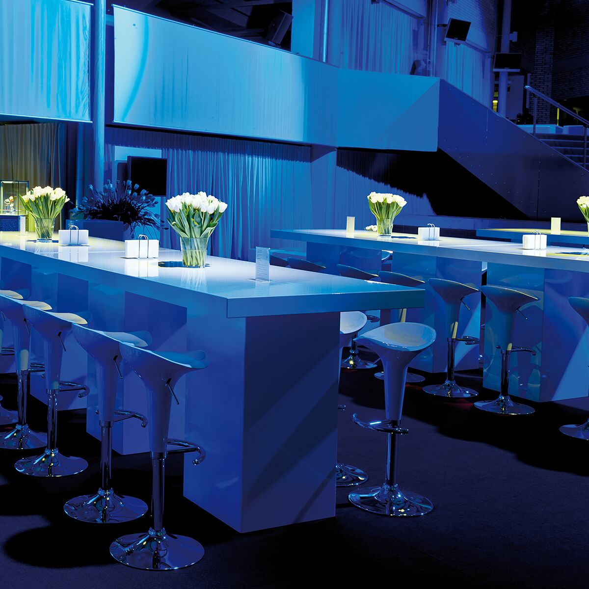 Der grosse Hochstehtisch zum mieten. Der massive Hochtisch wurde speziell für den temporären Event konstruiert. Die Einsatzgebiete sind dabei gross – ob an Ihrem Firmen Anlass, am Promotion Event oder am Messe Stand – der repräsentative Stehtisch bietet viel Platz für Ihre Gäste. Mit bis zu 10 Sitzplätzen auf hochwertigen Barhockern eignet sich der grosse Stehtisch zudem hervorragend als Alternative zu herkömmlichen runden Bankettischen mit Hussen. Neben dem Einsatz als Bankett Garnitur bietet sich der zeitlose Stehtisch auch hervorragend als grosse Besprechungsinsel für Ihren repräsentativen Messe oder Promotion Stand an.