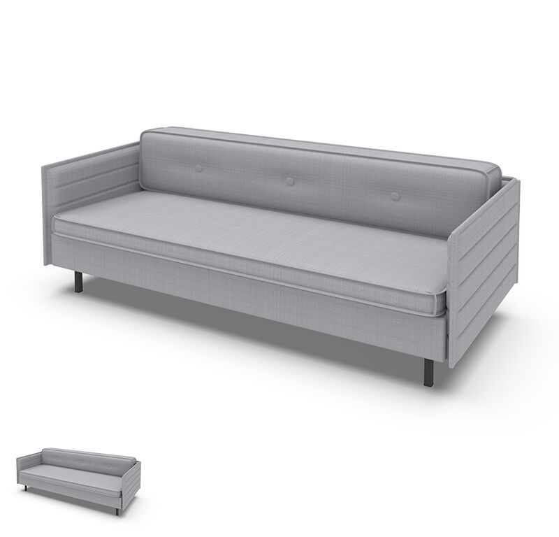 Sofa in hellgrau, hochwertiger Stoff Bezug, Beine aus Metall schwarz, Rücken-Kissen für den Transport demontierbar. Jetzt Ihr Sofa mieten für Event oder Messe.