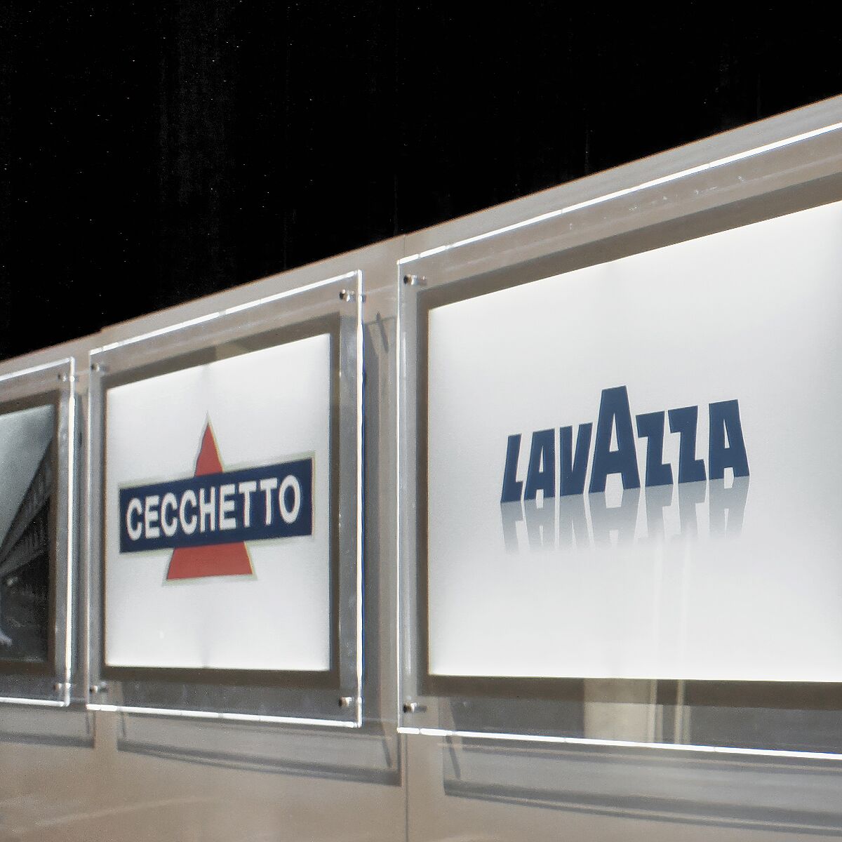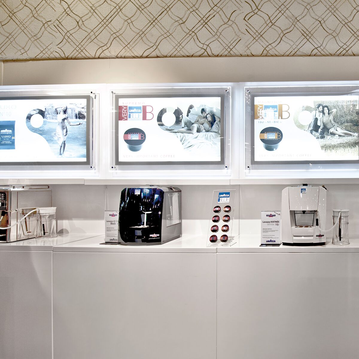 Theke & Screen-Rückwand aus Hochglanz Lackiertem Massiv Holz, mit höhenverstellbarem Tablar (kann auch mit geschlossener Front aufgestellt werden), inkl. 32″ / 40″ oder 42″ Screen, auch als Variante ohne Screens erhältlich.