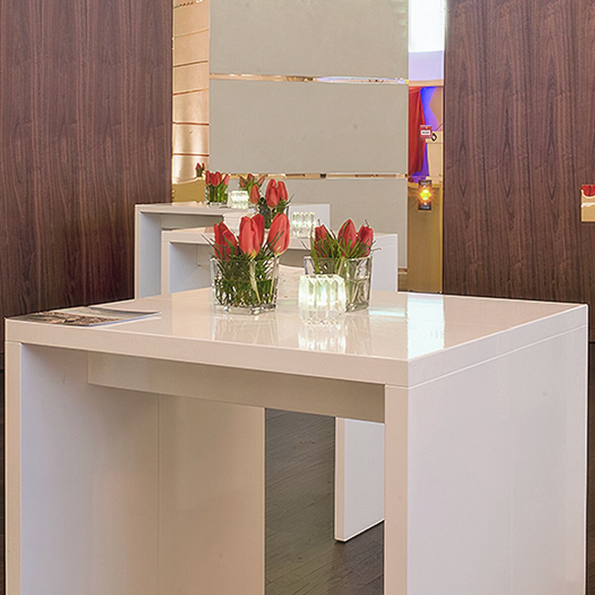 Event Stehtisch mieten – Der Stehtisch aus der CL Serie besticht durch das schlichte zeitlose Design und die elegante Hochglanz Oberfläche. Bieten Sie ihren Gästen auf dem Messestand oder an Ihrer Veranstaltung bis zu 6 Stehplätze oder, in Kombination mit Event Barhockern, einen komfortablen Sitzplatz. Auf dem Besprechungstisch für Ihre Kunden-Beratung finden zudem Laptops oder Kataloge genügend Platz.