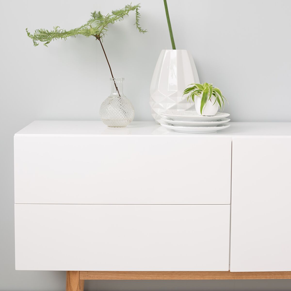 Sideboard Hochglanz weiss lackiert, 2 Schubladen, 1 Tür, Füsse Echtholz