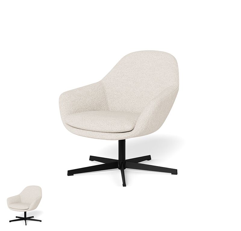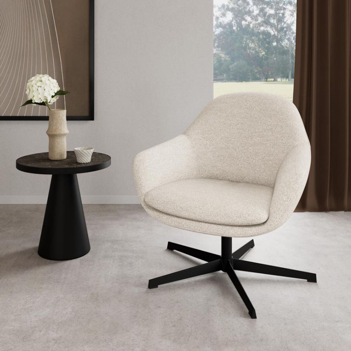 Hochwertiger Armsessel mieten mit hochwertiger Polsterung und edlem Stoffbezug in creme. Ausgestattet mit einem schwarz pulverbeschichteten 5-Stern-Fusskreuz in schwarz. Der Design Stuhl ist zudem drehbar.