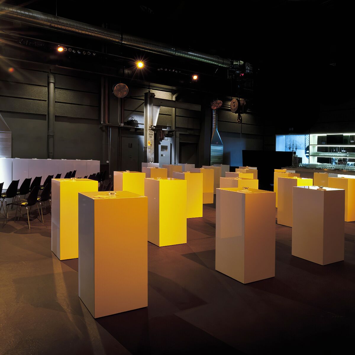 Stehtisch mieten – Durch sein schlichtes kubisches & zeitloses Design lässt sich der Stehcube für viele Bereiche einsetzten – ob als Apéro Tisch (als alternative zum herkömmlichen Bistrotisch zum mieten), als Besprechungsinsel, als Sockel für Ihre Ausstellungs Stücke oder als Redner Tisch für Diskussionsrunden – der massive & glanzlackierte Sockel in hochwertiger Verarbeitung wirkt dabei immer professionell. Auf Wunsch lassen sich die Sockel zum mieten auch temporär mit Ihrem Firmen Logo oder Event Brand beschriften. Wir übernehmen für Sie gerne den Druck & die Montage.